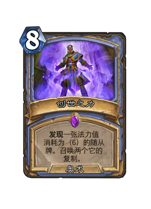 - 新:发现一张法力值消耗为(6)的随从牌。召唤两个它的复制。