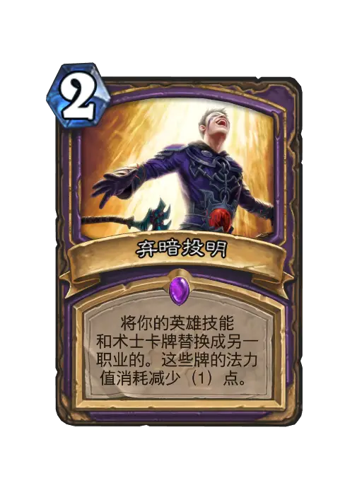 - 新:将你的英雄技能和术士卡牌替换成其他职业的。这些牌的法力值消耗减少(1)点。