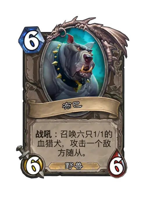 战吼:召唤六只1/1的血猎犬,攻击一个敌方随从。 Battlecry: Summon six 1/1 Bloodhounds to attack an enemy minion. | |
