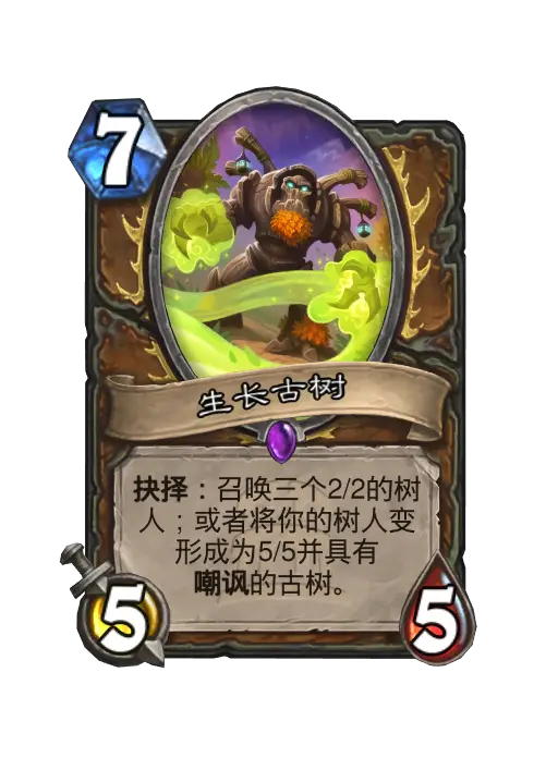 抉择:召唤三个2/2的树人;或者将你的树人变形成为5/5并具有嘲讽的古树。 Choose One - Summon three 2/2 Treants; or Transform your Treants into 5/5 Ancients with Taunt. | |
