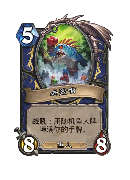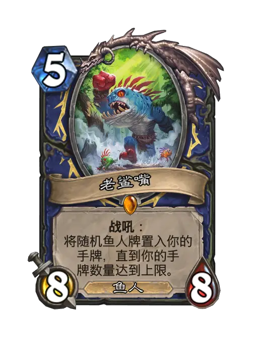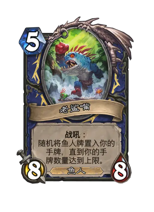 - 新:战吼:随机将鱼人牌置入你的手牌,直到你的手牌数量达到上限。