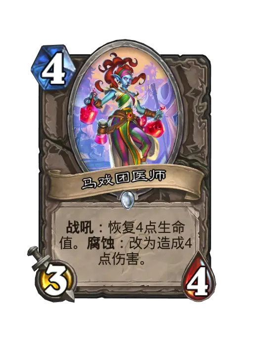 马戏团医师(Circus Medic)是疯狂的暗月马戏团加入的一张中立 随从牌。