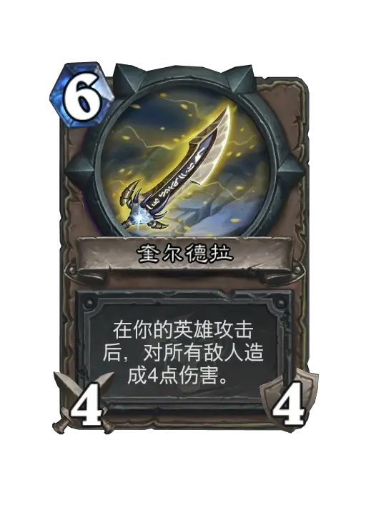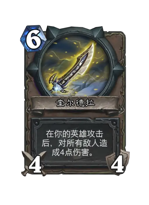 | 在你的英雄攻击后,对所有敌人造成4点伤害。 After your hero attacks, deal 4 damage to all enemies. | |