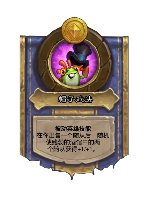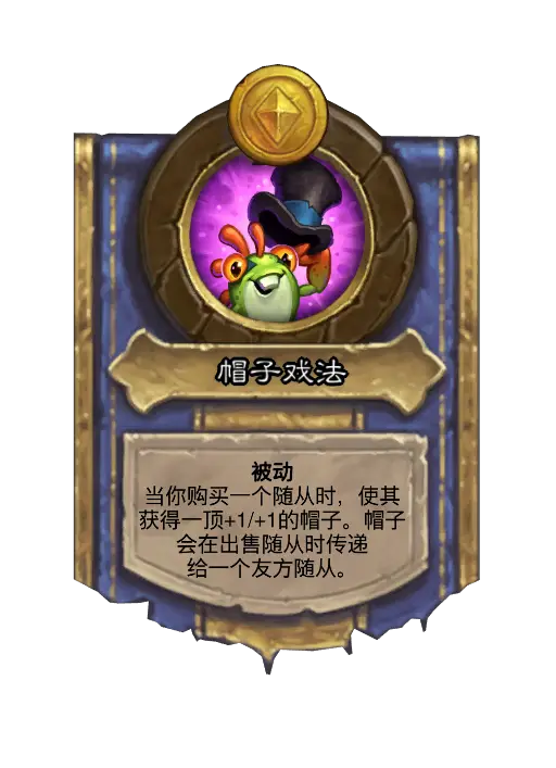 - 新:被动当你购买一个随从时,使其获得一顶+1/+1的帽子。帽子会在出售随从时传递给一个友方随从。