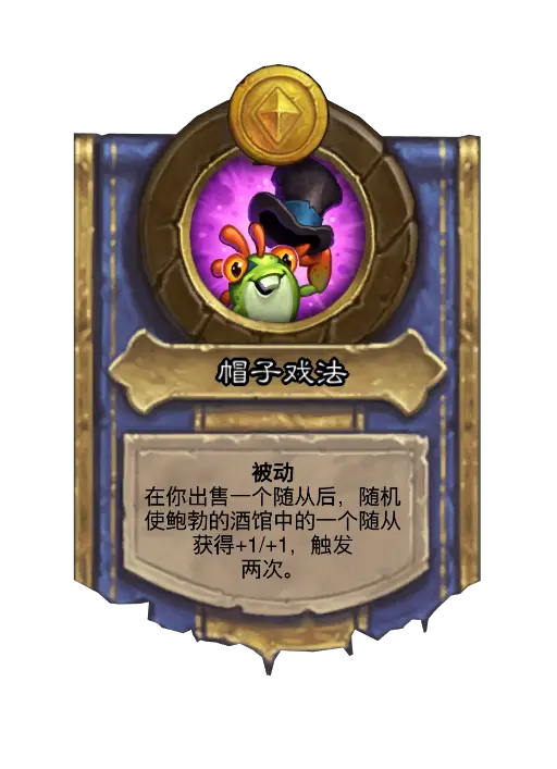 - 新:被动当你使用随从牌时,使其获得一顶+1/+1的帽子。帽子会在出售随从时传递给一个友方随从。