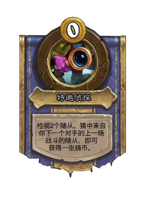 检视2个随从。猜中来自你下一个对手的上一场战斗的随从,即可获得一张铸币。 | |